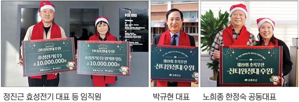 Á¤Áø±Ù È¿¼ºÀü±â¢ß ´ëÇ¥ÀÌ»ç´Â ÀÓÁ÷¿øµéÀÌ ½Ê½ÃÀÏ¹Ý ¸ðÀº 1000¸¸ ¿ø°ú ´ëÇ¥ÀÌ»ç º°µµÀÇ 1000¸¸ ¿øÀ» º¸Å ÃÑ 2000¸¸ ¿øÀ» ÃÊ·Ï¿ì»ê(ºÎ¿ï°æ±Ç¿ªÃѰýº»ºÎÀå À̼ö°æ)¿¡ Àü´ÞÇß´Ù. È¿¼ºÀü±â´Â 2015³âºÎÅÍ ÃÊ·Ï¿ì»ê°ú Àο¬À» ¸Î°í ÇØ¸¶´Ù ½ÅÇбâ Áö¿ø»ç¾÷, ÇдëÇÇÇØ¾Æµ¿ Áö¿ø, »êŸ¿øÁ¤´ë Áö¿ø µî ´Ù¾çÇÑ ÈÄ¿øÀ» ÅëÇØ Áö¿ª ³» Àú¼Òµæ °¡Á¤ ¾Æµ¿µé¿¡°Ô Èñ¸ÁÀ» Àü´ÞÇϰí ÀÖ´Ù.