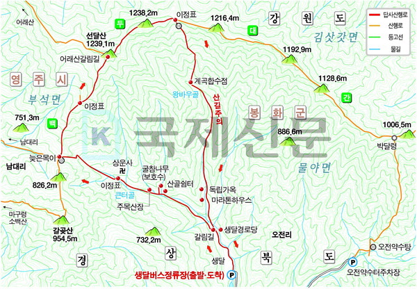 ¼±´Þ»ê »êÇà °æ·Î´Â ´ÙÀ½°ú °°´Ù. »ý´Þ¸¶À»¹ö½ºÁ¤·ùÀå~»ï°Å¸®~±¼Âü³ª¹« º¸È£¼ö~´ÊÀº¸ñÀÌ °¥¸²±æ~´ÊÀº¸ñÀÌ~ÀÌÁ¤Ç¥ °¥¸²±æ~¾î·¡»ê °¥¸²±æ~¼±´Þ»ê Á¤»ó~1238.2ºÀ~¿Ë´Þ»ù °¥¸²±æ(¹Ú´ÞÀç 3.9§°¡¤¼±´Þ»ê1.1§° ÀÌÁ¤Ç¥)~¿Ë´Þ»ùÅÍ~¿Õ¹Ù¿ì°ñ~¸¶¶óÅæ Ææ¼Ç ÀÔ±¸ °¥¸²±æ~YÀÚ °¥¸²±æ~»ý´Þ¸¶À»¹ö½ºÁ¤·ùÀåÀ¸·Î µÇµ¹¾Æ¿À´Â ¿øÁ¡È¸±Í ÄÚ½ºÀÌ´Ù. »êÇà °Å¸®´Â ¾à 11.7§°À̸ç, 5½Ã°£30ºÐ ¾ÈÆÆ °É¸°´Ù.