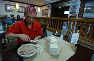 ÀüÅëÀûÀÎ ¹æ½ÄÀÇ ¼öÁ¦ ¿Ï´ç Á¦Á¶¹ýÀ» °í¼öÇϰí ÀÖ±ä ÇÏÁö¸¸ ³Ê¹« ¸¹Àº ¼Õ´ÔÀÌ ¸ô·Áµå´Â ¹Ù¶÷¿¡ ÇÒ ¼ö ¾øÀÌ 2000³â ÀÌÈÄ ¿Ï´ç ÇÇ ±â°è¸¦ µµÀÔÇß´Ù. »ç¶÷ÀÌ ¼ÕÀ¸·Î ¹ÝÁ×ÇÏ°í ºú¾î¼ 0.3§®ÀÇ ¹Ð°¡·ç ÇǸ¦ ¸¸µé±â¿¡´Â ¶Ù¾î³ ¿ä¸®»ç 1~2¸íÀÇ ´É·Â ÇÑ°è ¹üÀ§¸¦ ³Ñ¾î¼¹±â ¶§¹®ÀÌ´Ù. ÇÏÁö¸¸ ¿©ÀüÈ÷ À°¼ö Á¦Á¶¿Í ¿Ï´ç »î±â µîÀº ÀüÅë ¹æ½ÄÀ» °í¼öÇÑ´Ù. ÀÌ·± ±×¿¡°Ô 50³â °æ·ÂÀÇ ÁÖ¹æÀå ÃÖ¸ÍÈ£(64) ¾¾´Â µçµçÇÑ ¿ì±ºÀÌÀÚ µ¿Áö´Ù.