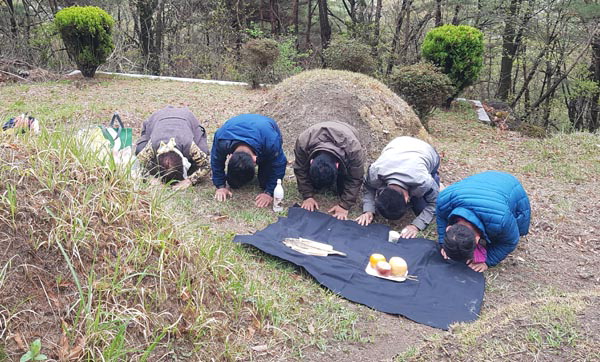 ÇÑ °¡Á·ÀÌ Ãß¼®À» ¸Â¾Æ Á¶»óÀÇ »ê¼Ò¸¦ ã¾Æ ÀýÀ» Çϰí ÀÖ´Ù. |