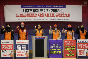 | µµ·Î±³Åë¾ÈÀü°ü¸® ³ëÁ¶¿øµéÀÌ 3ÀÏ ¿ï»ê½Ãû ÇÁ·¹½º¼¾ÅÍ¿¡¼ ÆÄ¾÷ ¿¬ÀåÀ» ¼±¾ðÇÏ´Â ±âÀÚȸ°ßÀ» ¿°í ÀÖ´Ù. µµ·Î±³Åë¾ÈÀü°ü¸®³ëÁ¶ Á¦°ø