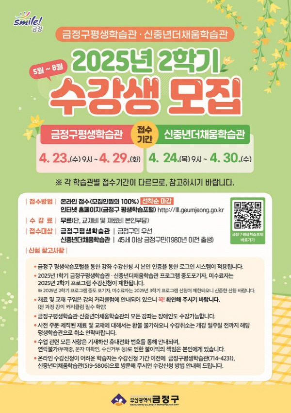 ºÎ»ê½Ã ±ÝÁ¤±¸(±¸Ã»Àå À±ÀÏÇö)´Â ±ÝÁ¤±¸ Æò»ýÇнÀÆ÷ÅÐ ´©¸®ÁýÀ» ÅëÇØ 2025³â 2Çбâ(5¿ù~8¿ù) ±ÝÁ¤±¸ Æò»ýÇнÀ°ü°ú ½ÅÁß³â´õä¿òÇнÀ°ü ÇÁ·Î±×·¥ ¼ö°»ýÀ» ¼±Âø¼øÀ¸·Î ¸ðÁýÇÑ´Ù°í ¹àÇû´Ù.