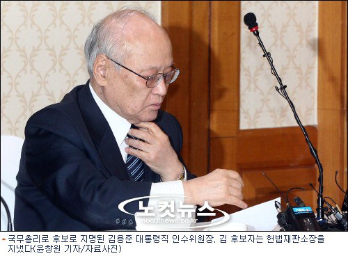 Çå¹ýÀçÆÇ¼ÒÀåÀ» Áö³½ ±è¿ëÁØ ´ëÅë·ÉÁ÷ ÀμöÀ§¿øÀåÀÌ ±¹¹«ÃѸ® È帷ΠÁö¸íµÇ¸é¼ ±è¿ëÁØ ÃѸ®Èĺ¸ÀÚÀÇ °¢Á¾ ÀÇȤ°ú´Â º°µµ·Î »ö´Ù¸¥ ¼¿ ³íÀïÀÌ ºú¾îÁö°í ÀÖ´Ù.