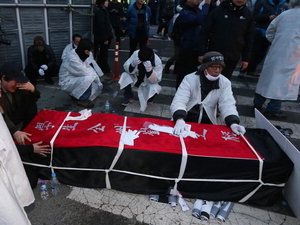 Âü°¡ÀÚµéÀº Á¤¹® ÂÊ µµ·Î°¡ °æÂû¿¡ ¸·È÷ÀÚ Æ¯¼ö¼±°øÀå ÂÊ ¼¹®À» ¿¾ú°í ¿ÀÈÄ 6½Ã20ºÐ²² 150¿© ¸íÀÌ °ü°ú ÇÔ²² ÇÑÁøÁß°ø¾÷ °øÀå ¾ÈÀ¸·Î µé¾î°¬´Ù. À̵éÀº ÁøÀÔ ÈÄ °üÀ» ÇÑÁøÁß°ø¾÷ Á¤¹® ÂÊÀ¸·Î ¿Å°å°í ÃÖ ¾¾ °¡Á·µéµµ ÇÔ²² ÀÖ´Â °ÍÀ¸·Î ¾Ë·ÁÁ³´Ù. ¶Ç ±Ý¼Ó³ëÁ¶ Ãø °ü°èÀÚ°¡ Å©·¹Àο¡ ¿Ã¶ó°¬´Ù°¡ ³»·Á¿Â °ÍÀ¸·Î ÀüÇØÁ³´Ù.