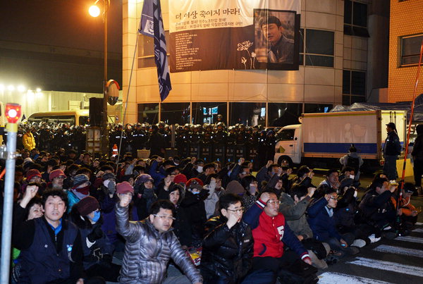 ±Ý¼Ó³ëÁ¶´Â À̳¯ ¹ã 11½Ã ÇöÀç ÃÖ ¾¾ÀÇ °üÀ» º¸°üÇÒ ³Ãµ¿Å¾Â÷¸¦ °øÀå ¾ÈÀ¸·Î ÁøÀÔ½ÃÄÑ ÁÙ °ÍÀ» ¿ä±¸Çϰí ÀÖÀ¸³ª ÇÑÁøÁß°ø¾÷Àº ÃâÀÔ¹®À» ´Ý°í ÁøÀÔÀ» ¸·°í ÀÖ´Ù. Âü°¡ÀÚµé°ú °æÂûÀº ÇÑÁøÁß°ø¾÷ Á¤¹® ¾Õ¿¡¼ ¹ã´Ê°Ô±îÁö ´ëÄ¡»óŸ¦ À̾´Ù.