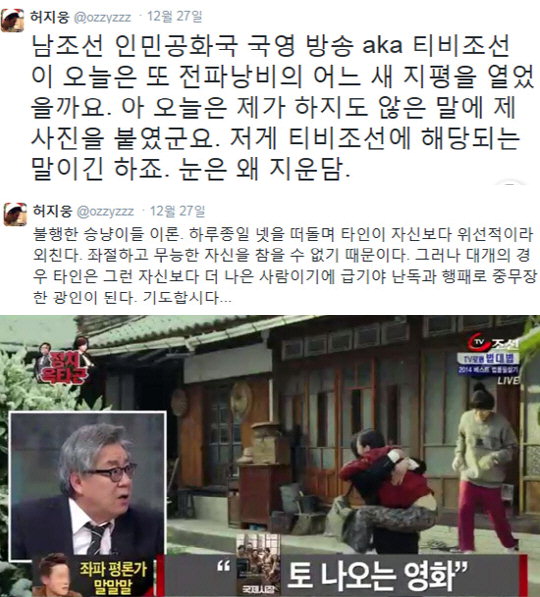 ÇØ´ç ¹ß¾ðÀ» ºÎ°¢ÇØ ³í¶õÀÌ µÇÀÚ, ÇãÁö¿õÀº 27ÀÏ ÀÚ½ÅÀÇ Æ®À§ÅÍ¿¡ "³²Á¶¼± ÀιΰøÈ±¹ ±¹¿µ ¹æ¼ÛÀÌÀÚ TVÁ¶¼±ÀÌ ¿À´ÃÀº ¶Ç ÀüÆÄ ³¶ºñÀÇ ¾î´À »õ ÁöÆòÀ» ¿¾úÀ»±î¿ä. ¾Æ, ¿À´ÃÀº Á¦°¡ ÇÏÁöµµ ¾ÊÀº ¸»¿¡ Á¦ »çÁøÀ» ºÙ¿´±º¿ä. Àú°Ô TVÁ¶¼±¿¡ ÇØ´çµÇ´Â ¸»À̱ä ÇÏÁÒ"¶ó´Â ±ÛÀ» °ÔÀçÇß´Ù.
