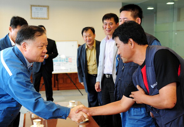 25ÀÏ ¿ÀÈÄ ºÎ»ê ¿µµµ±¸ ÇÑÁøÁß°ø¾÷ ¿µµµÁ¶¼±¼Ò º»°ü ȸÀǽǿ¡¼­ ¿­¸° ÇÑÁøÁß°ø¾÷ Á¤¸®ÇØ°í »çÅÂ ÇØ°áÀ» À§ÇÑ ³ë»çÁ¤ °£´ãȸ¿¡ ¾Õ¼­ ÀÌÀç¿ë(¿ÞÂÊ) »çÀå°ú ±Ý¼Ó³ëÁ¶ ±èÈ£±Ô ºÎÀ§¿øÀåÀÌ ¾Ç¼ö¸¦ Çϰí ÀÖ´Ù. ÇÑÁøÁß ³ë»ç´Â ±¹È¸ û¹®È¸ ÀÌÈÄ Ã¹ °£´ãȸ¸¦ ¿­¾úÀ¸³ª º°´Ù¸¥ ÁøÀüÀ» º¸Áö ¸øÇß´Ù. ±è¼ºÈ¿ ±âÀÚ kimsh@kookje.co.kr